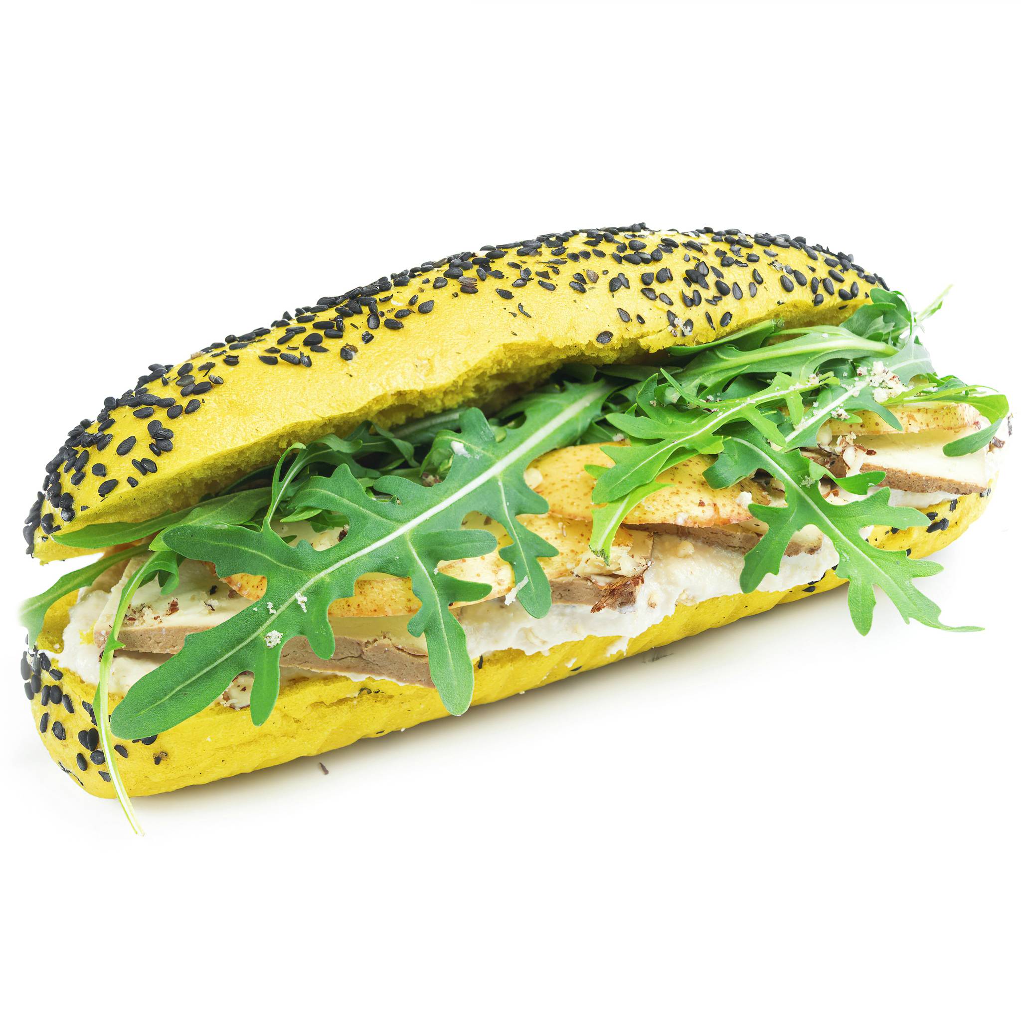 hruška, naravno dimljen tofu, hrenov namaz z jabolki, indijski oreščki, rukola, rumena bageta s kurkumo in črnim sezamom